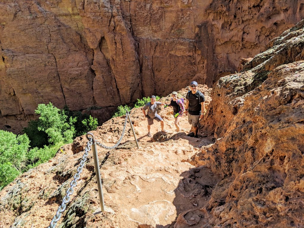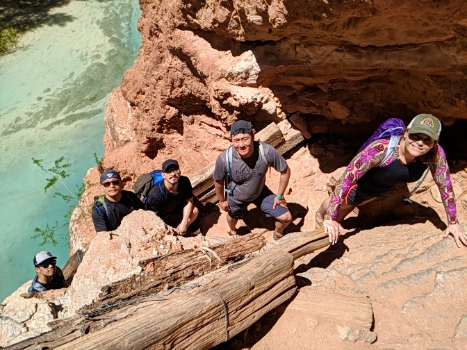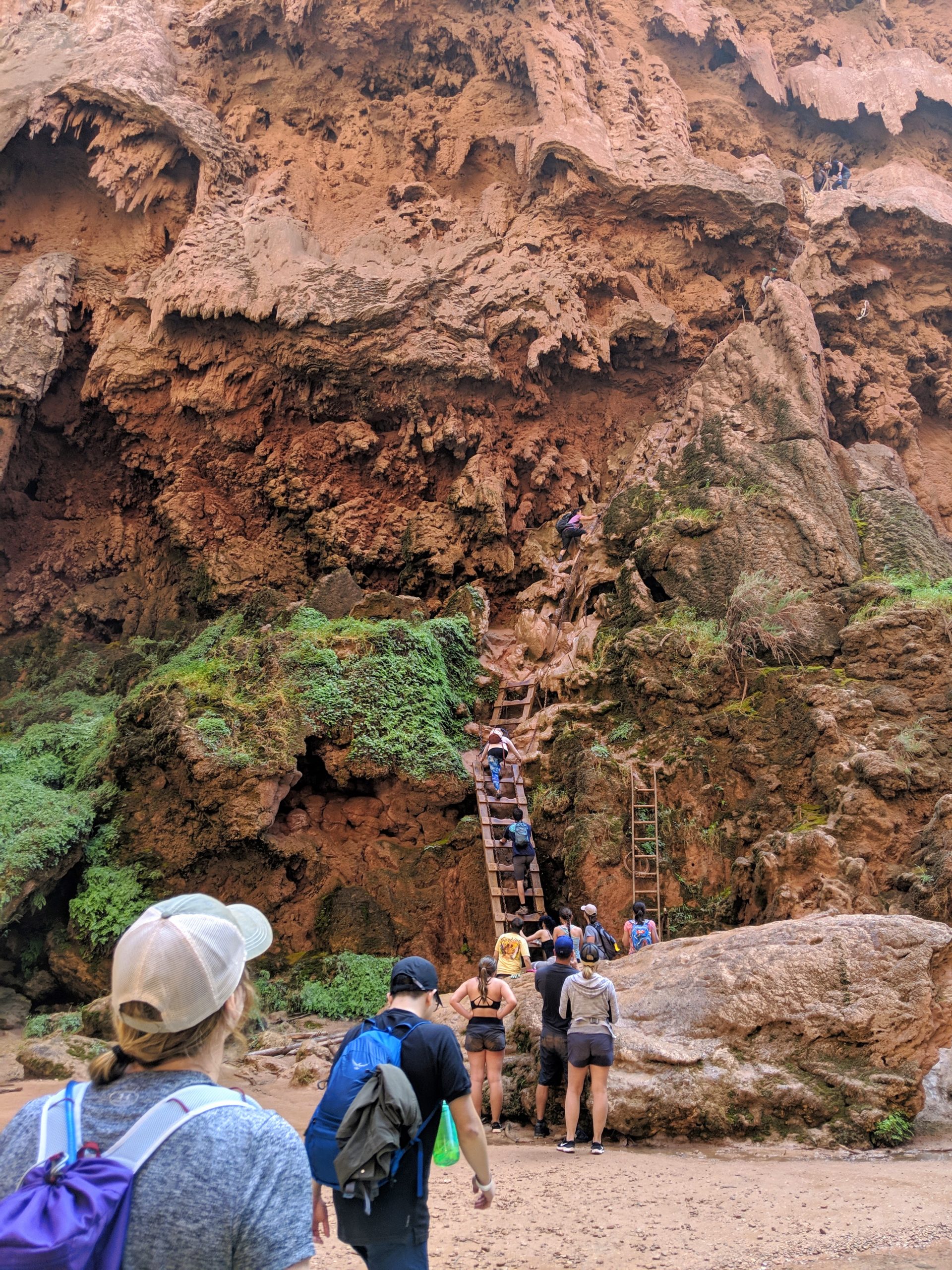 We started our descent down to Mooney Falls first, which was roughly 2 miles from our campground. And boy, did this felt more like an obstacle course than a hike! We went through caves and down vertical ladders to get to the bottom of Mooney Falls. Not required, but definitely recommend some beater gloves for the rocks, chains, rungs, and wooden ladders. Unfortunately, someone in our group did get a cut from this hike without it.